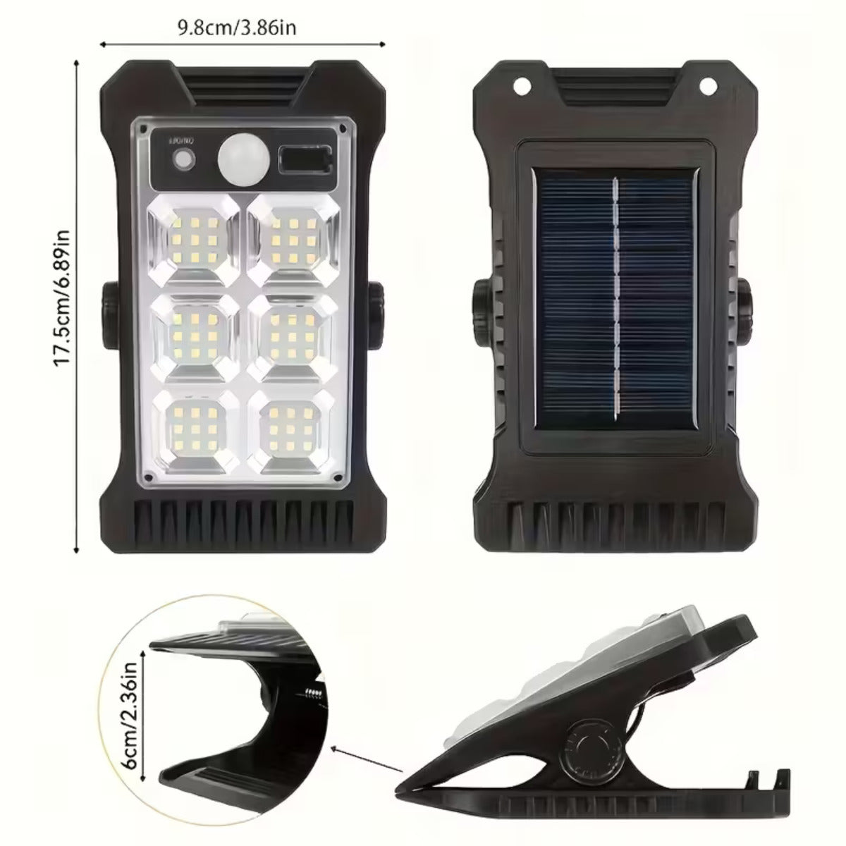 🌞 Luz Solar Clip-On com 72 LEDs – Super Brilhante, Sensor de Movimento, USB Backup & Cobertura de 270°